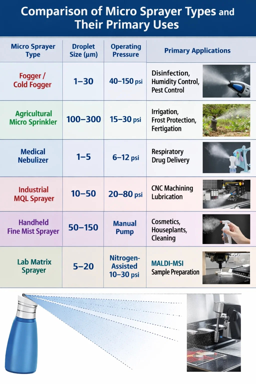 Các cấu hình máy phun vi mô khác nhau được tối ưu hóa cho các ứng dụng cụ thể. Chọn sai loại dẫn đến phạm vi phủ sóng kém, lãng phí vật liệu hoặc hư hỏng thiết bị. Bảng dưới đây tóm tắt các loại máy phun vi mô phổ biến nhất, kích thước giọt điển hình, áp suất vận hành và các trường hợp sử dụng tốt nhất.