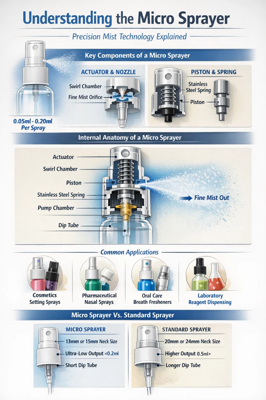 Để trả lời câu hỏi "Máy phun siêu nhỏ là gì?" , nó là một thiết bị phân phối được thiết kế chính xác được thiết kế để chuyển đổi chất lỏng thành dạng sương mù cực kỳ mịn, ổn định với âm lượng đầu ra rất thấp trên mỗi hành trình. Không giống như máy phun kích hoạt tiêu chuẩn được sử dụng để làm sạch hộ gia đình, máy phun vi mô thường phân phối giữa 0,05ml và 0,20ml của sản phẩm tại một thời điểm, khiến nó trở thành lựa chọn lý tưởng cho chất lỏng có giá trị cao, nơi việc kiểm soát liều lượng và ứng dụng tinh tế là điều tối quan trọng.